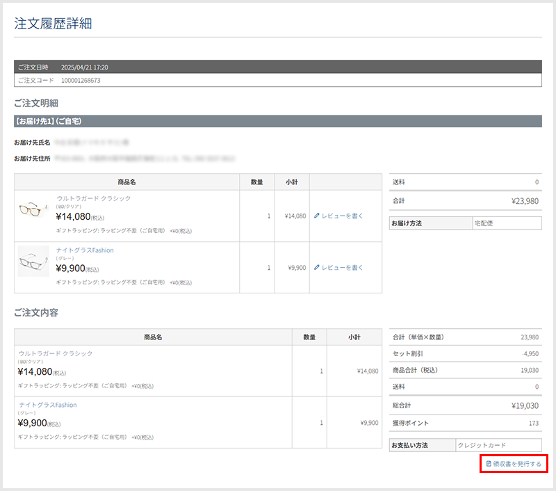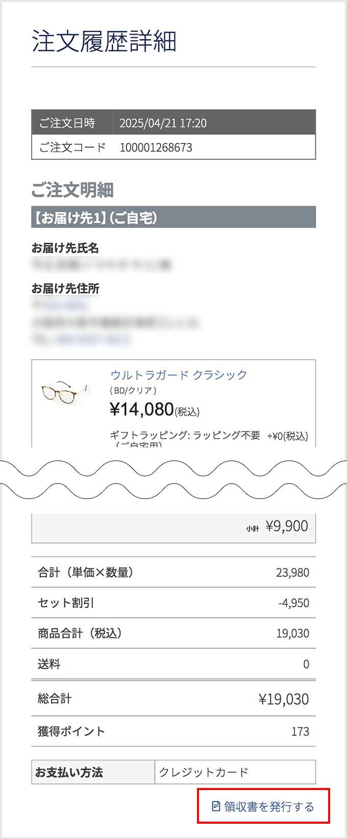 ※代引引換でのご注文の場合は、マイページからの領収書発行機能はご利用いただけませんので配送業者の送り状控えをご参照ください。